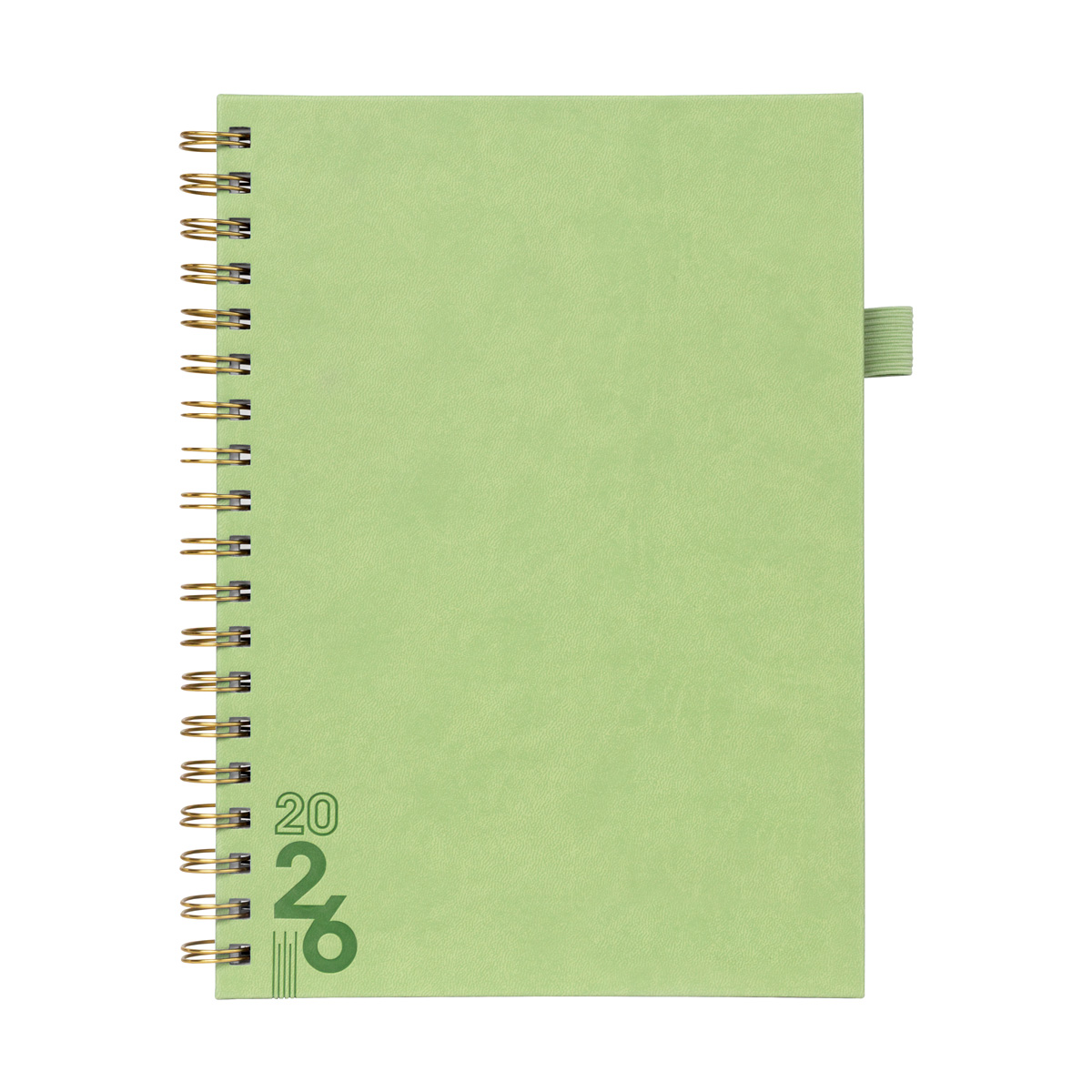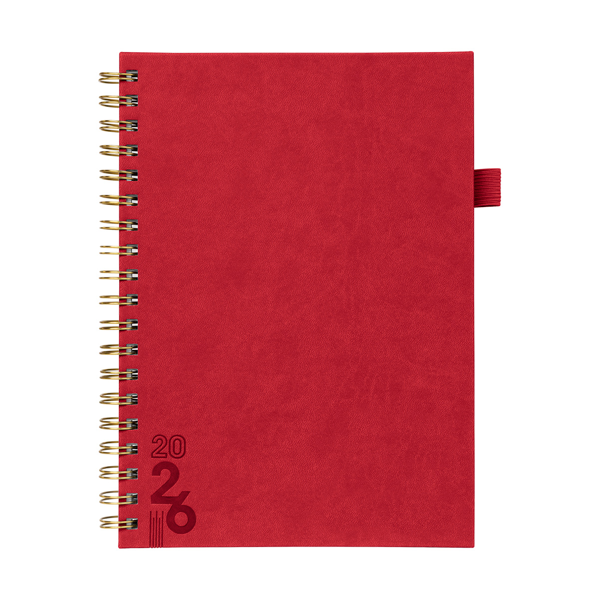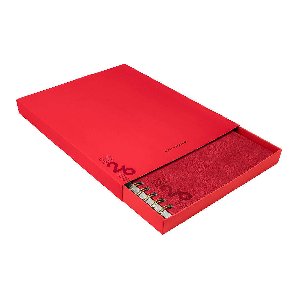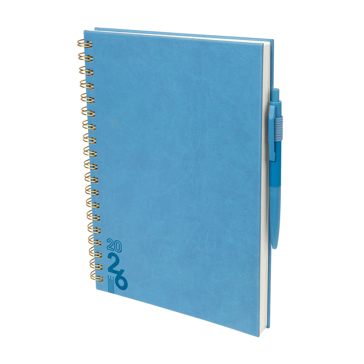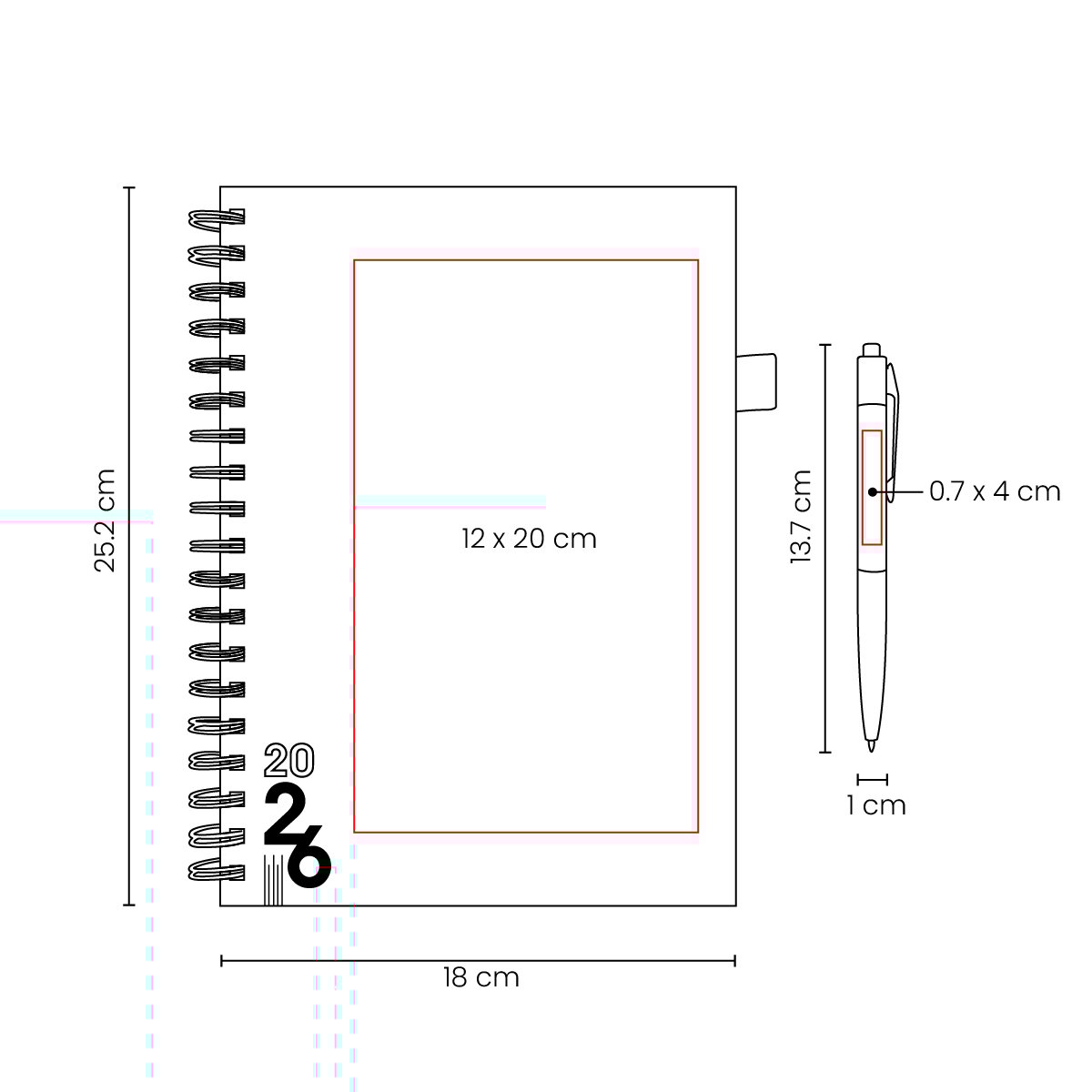 Agenda semanal con 80 hojas. Contiene datos personales, calendarios 2025-2026-2027, planeador 2026, seguimiento de nuevos hábitos, organizador de tareas, planeador de proyectos y días festivos. Incluye caja individual del mismo color a la agenda y bolígrafo.