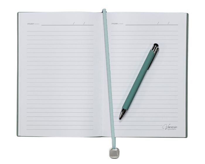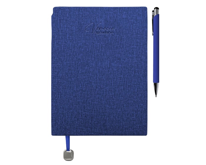 Agendario de pasta flexible texturizada de 112 hojas (224 páginas), contiene: cuadro de dedicatoria, hoja de datos, calendarios de 2026 a 2029, planificador anual (4); planificador de gastos (4); planificador de proyectos (5), agendario, hoja para notas punteada y listón separador con placa metálica. Incluye: Bolígrafo de aluminio del color de la libreta con mecanismo de click. El bolígrafo se puede insertar en el lomo de la libreta para transportarlo de forma segura. Presentación: caja de regalo a color.