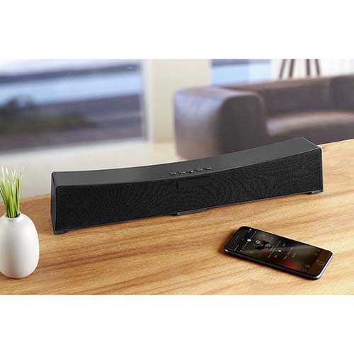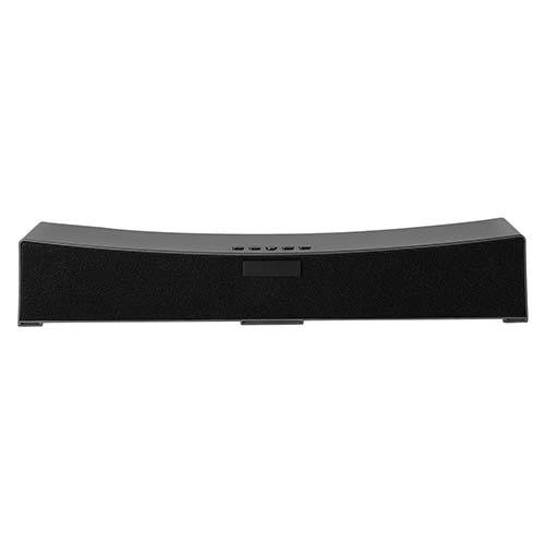 Mini barra de sonido bluetooth de con dos bocinas de 5W de potencia cada una. Batería recargable con duración de 10 hrs aproximadamente. Controles integrados de llamada, volumen y reproducción de audio. Entrada de tarjeta microSD, modo radio FM y función manos libres. Cable cargador micro USB y cable de audio incluidos.