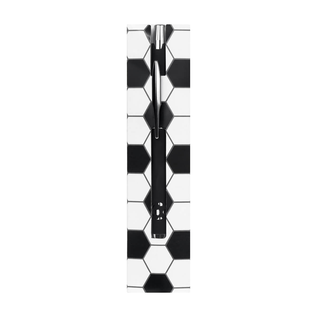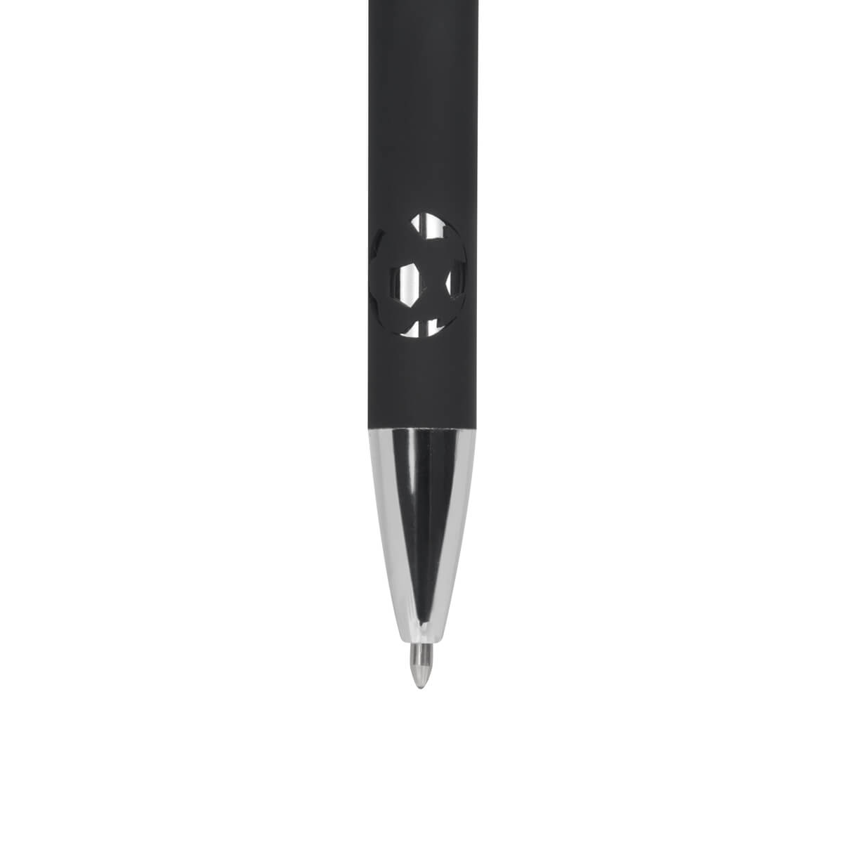 Bolígrafo metálico, con acabado mate y detalles cromados, con un diseño de balón suajado en el cuerpo. Mecanismo pulsador. Incluye funda con diseño soccer.