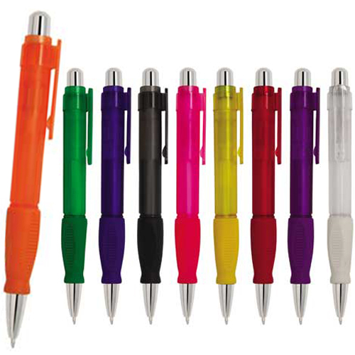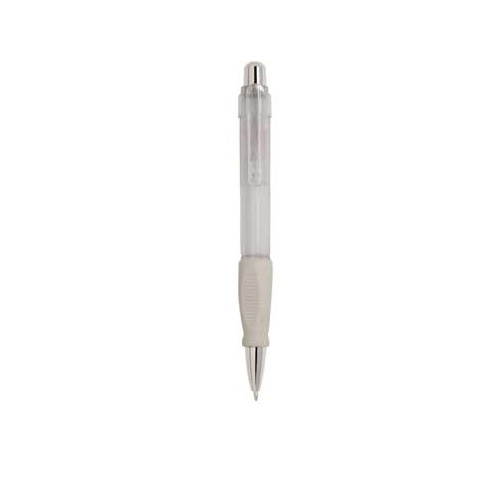 Bolígrafo de plástico traslúcido con grip de goma.