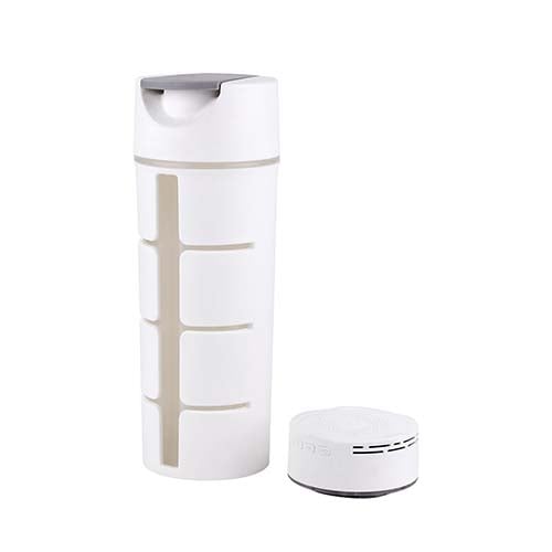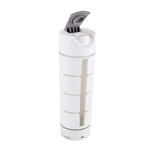Cilindro con bocina bluetooth. Funcion manos libres. Controles integrados de volumen y reproducción de audio. Disparador de cámara al sincronizar con el smartphone. Base para tablet y smartphone. Bocina removible con efectos de luces. Incluye cable USB y batería recargable. Tapa de plástico con cierre de rosca y boquilla, sobretapa con cierre de presión. Caja individual incluida.