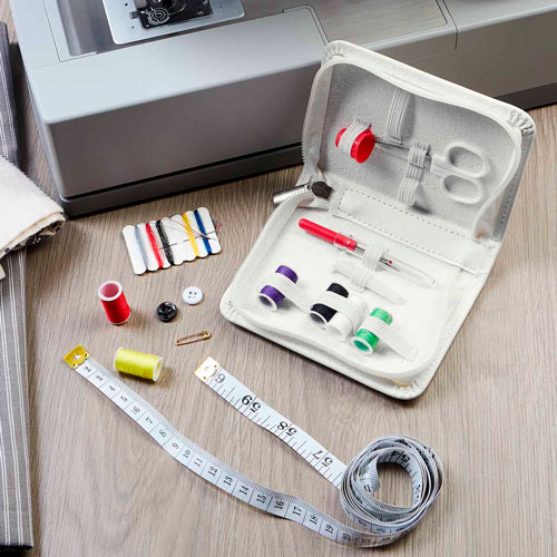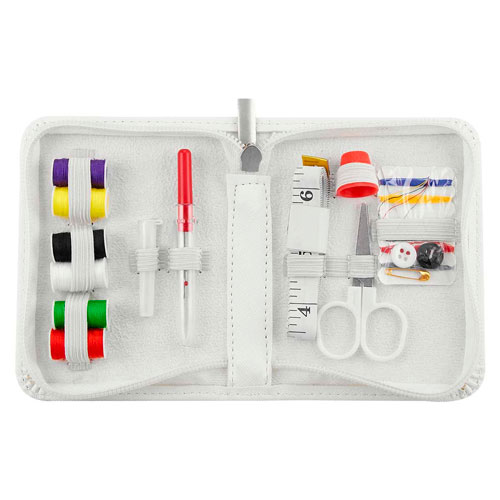 Incluye tijeras, descosedor, 6 carretes de hilos, cinta métrica, dedal, tubo de plástico con 5 agujas y set de costura portátil con hilos, botones y alfiler.