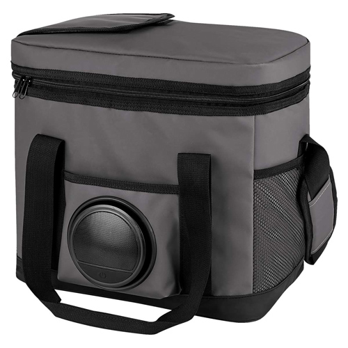 Hielera con bocina bluetooth desprendible con batería recargable de 2 horas de reproducción de música aproximadamente. Interior plastificado impermeable. Cubierta con ventana para fácil acceso al interior. Incluye bolsa frontal para bocina, 2 bolsas laterales de red, asas y correa ajustable. Capacidad para 24 latas.