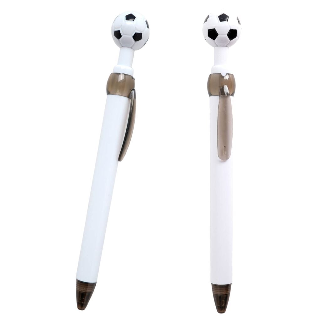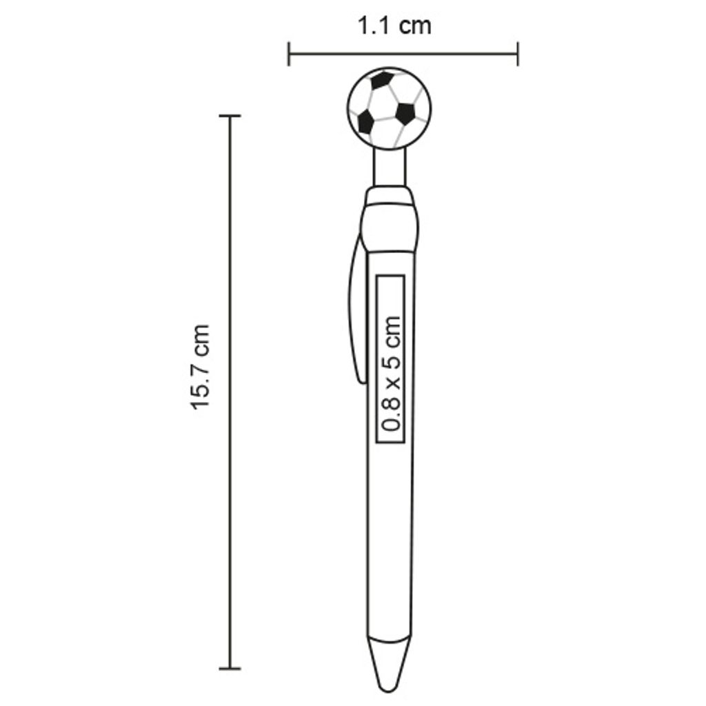 Bolígrafo plástico con clip y figura de balón en la parte superior, que sirve como botón.