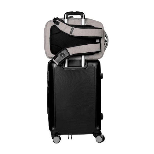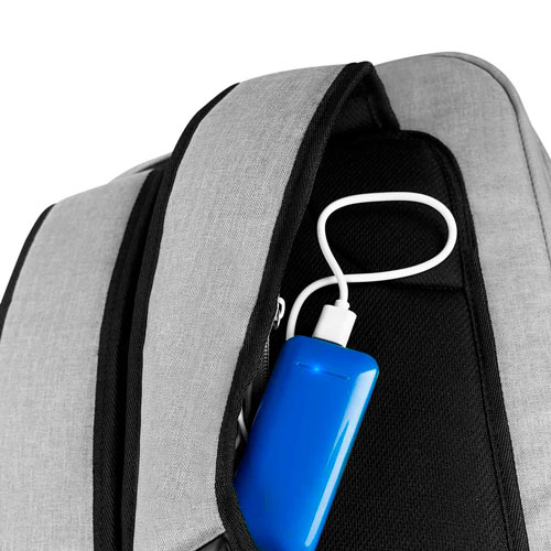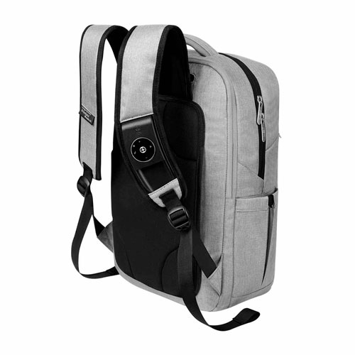 2 Bolsas principales con compartimento interno para laptop de 15 y tablet, 2 bolsas frontales con cierre, 2 bolsas laterales y 1 bolsa trasera con cierre. Tirante con compartimento con salida USB (se requiere conectar a una batería auxiliar) para cargar smartphone y dispositivo bluetooth de reproducción de audio y llamada. Salida USB y de audio de 3.5 mm. (Batería auxiliar no incluida.) Aditamento especial trasero para poner en trolley. Tirantes y espalda acojinados.