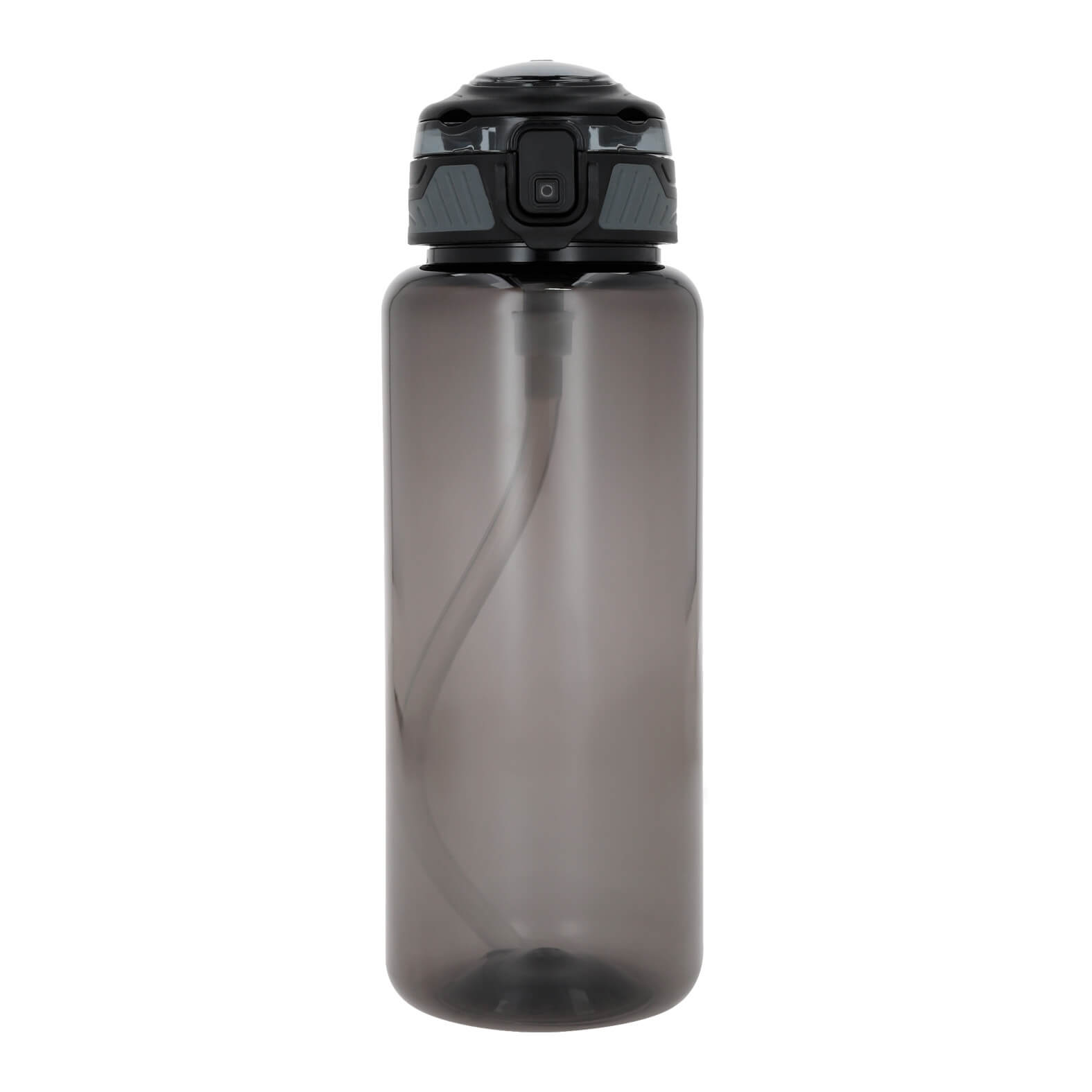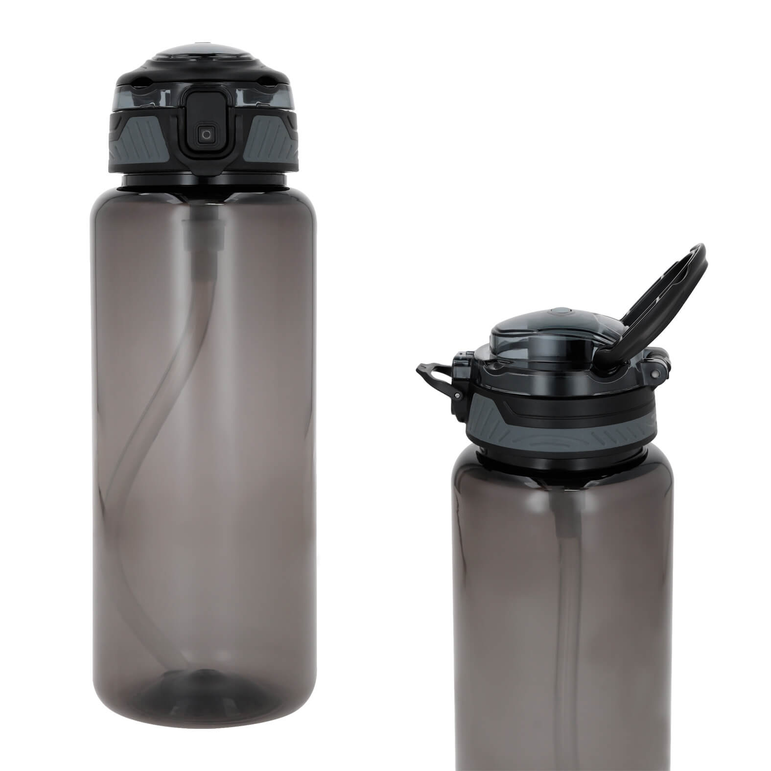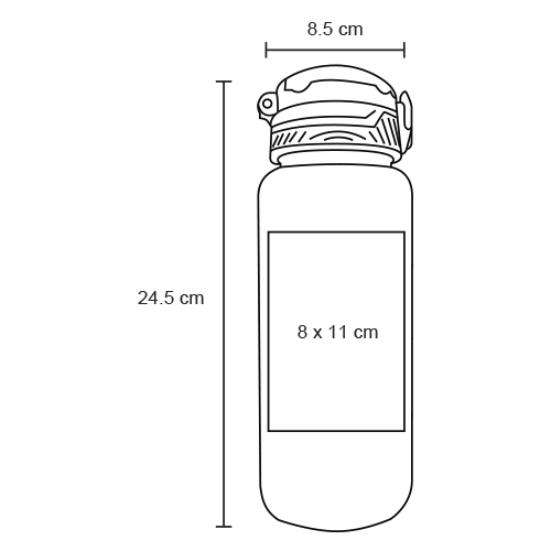 Cilindro de plástico con tapa enroscable, broche de seguridad, popote retractil y asa.