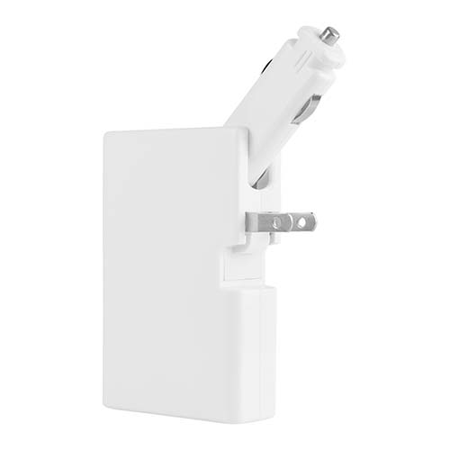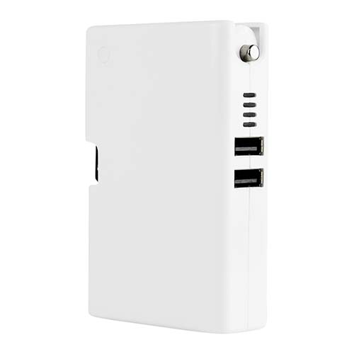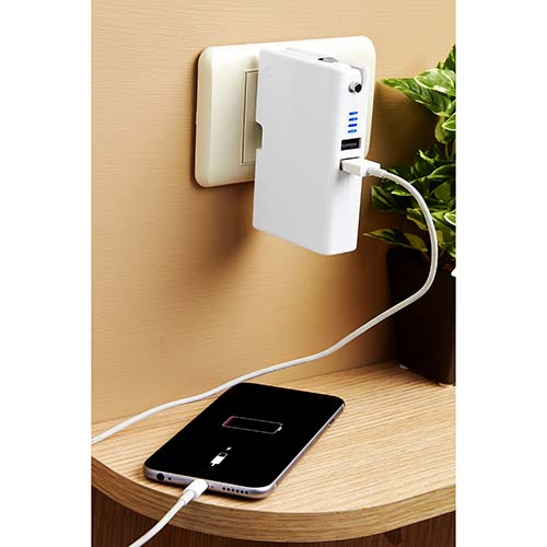 Batería auxiliar para smartphone, capacidad 5,000 mAh y doble puerto USB. Cuenta con clavija para conectarse a un enchufe de pared y conector para cargador de carro. Agitar para verificar el nivel de batería. Incluye cable cargador compatible con USB y micro USB.