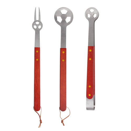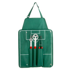 Set de BBQ en delantal con diseño de cancha de fútbol. Incluye espátula, pinzas y tenedor.