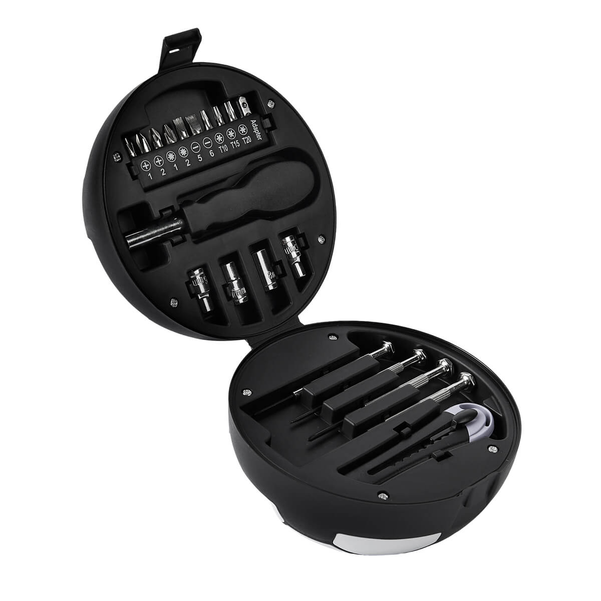Set de herramientas con diseño de balón de fútbol soccer. Contiene 4 desarmadores relojeros con 4 puntas distintas, desarmador con 10 puntas diferentes e intercambiables, 4 dados y cúter. Estuche de plástico en forma de balón. Incluye caja individual.