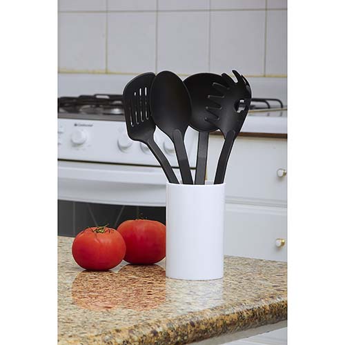 Incluye base y 4 utensilios de cocina: cuchara, cucharón, pala y cuchara de pasta.