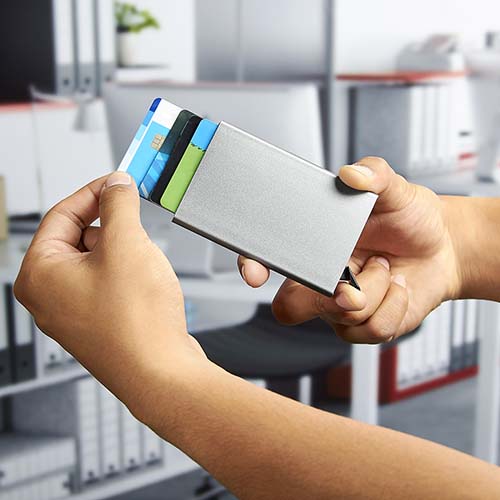 Tarjetero vertical. Mecanismo pop up para desplegar tarjetas. Sistema anti robo RFID.