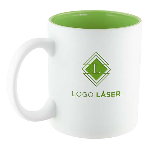 Taza con recubrimiento interior de color para resaltar el logo una vez aplicado el grabado láser.